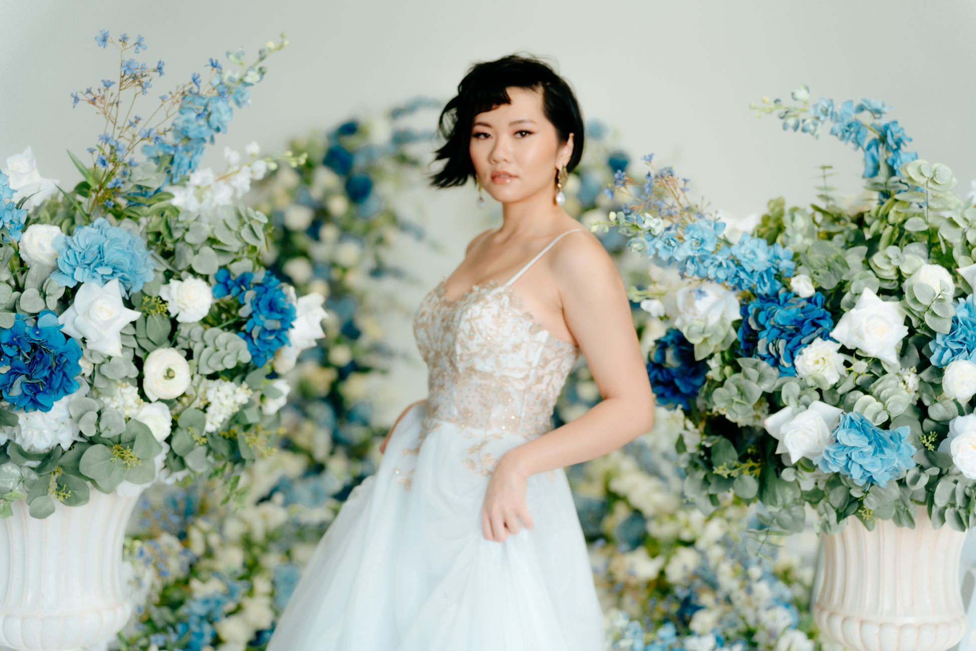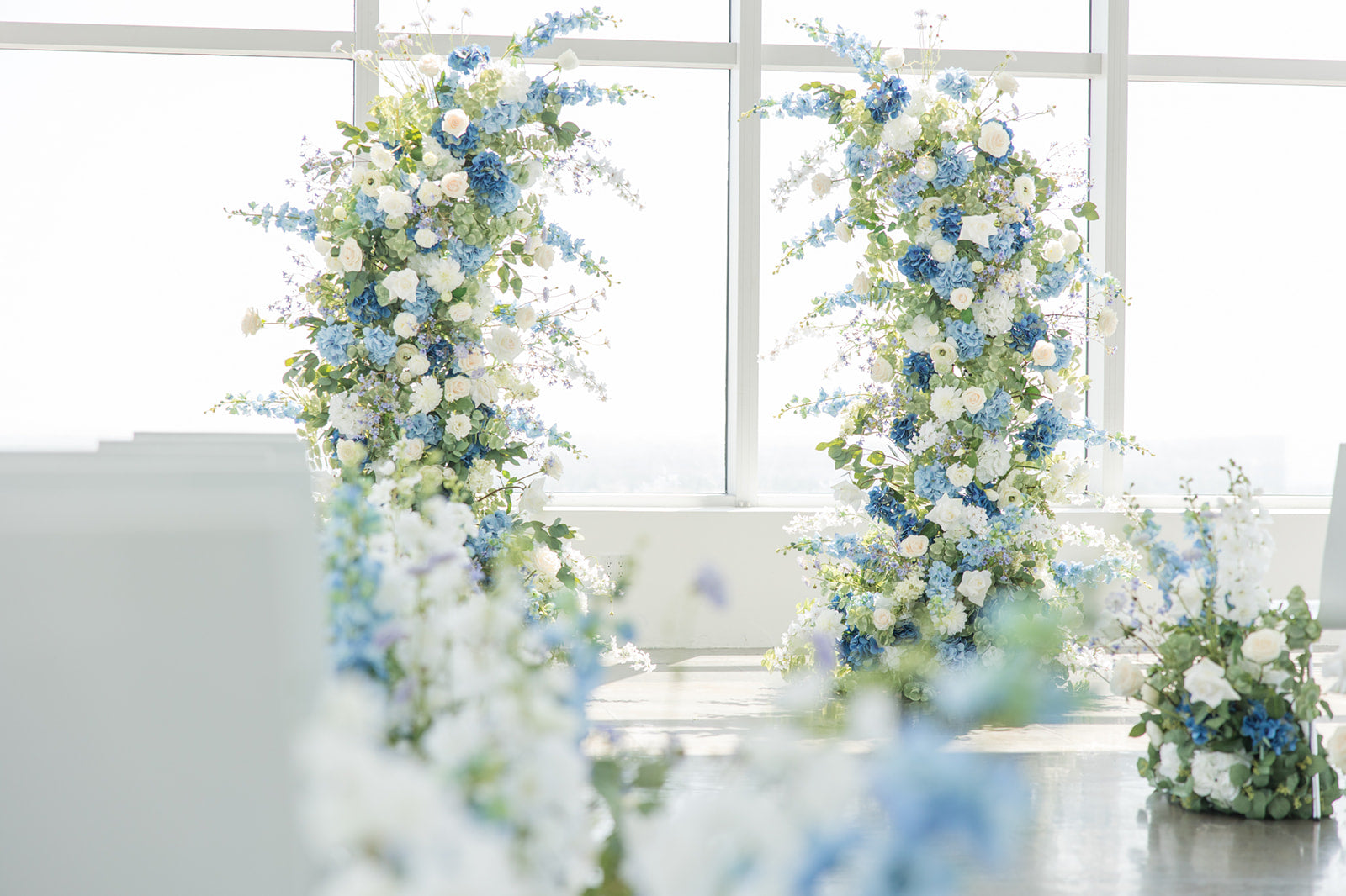 Designed with a graceful blend of garden-style florals in shades of white, dusty blue, deep blue, and soft greenery. This design includes white garden roses, dusty blue delphinium, lisianthus, white dahlias, hydrangeas, lilac, anemones, delicate wax flowers, and lush eucalyptus.